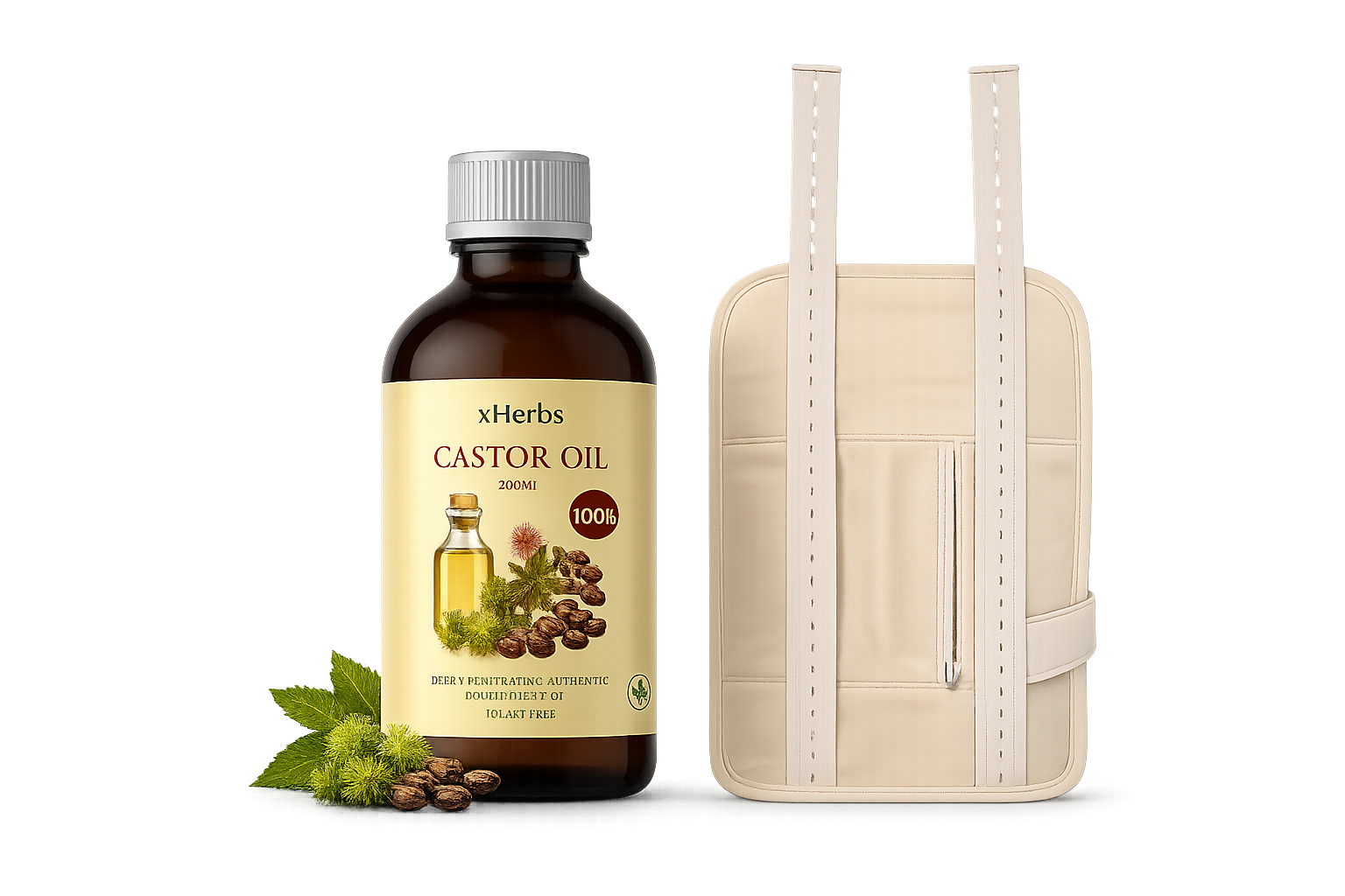 The xHerbs Castor Oil Wellness Pack includes 100% pure cold-pressed castor oil and a reusable adjustable castor oil wrap, making castor oil packs easy, clean, and relaxing to use at home.